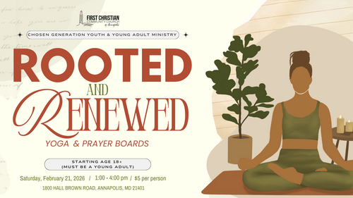 Join us for Rooted & Renewed, a young adult experience designed to help you reset and refocus. All supplies are included, and the cost is $5 per person. Come move, connect, and be renewed with a supportive community.