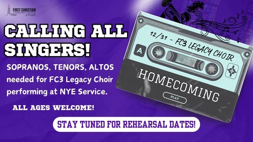Calling all singers to once again join the Legacy Choir as we prepare for our New Year's Eve Worship Celebration! We will be rehearsing on Monday, December 22 and 29th at 7:00 p.m.